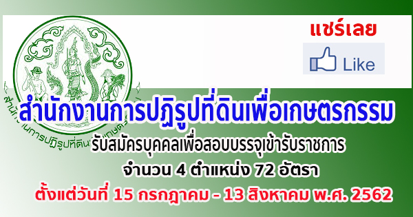 สำนักงานการปฏิรูปที่ดินเพื่อเกษตรกรรม (สปก.) เปิดรับสมัครสอบเพื่อบรรจุเข้ารับราชการ จำนวน 72 อัตรา รับสมัครทางอินเทอร์เน็ต ตั้งแต่วันที่ 15 กรกฎาคม - 13 สิงหาคม 2562